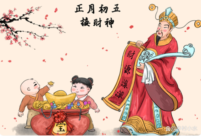 正月初五是财神的诞辰,因此在我国民间正月初五是“迎财神”的日子,财神分为武财神和文财神,其负责掌管一家人的财运,因此这天我们要迎接财神,以祈求新的一年财运亨通,这反映了人们对美好生活的追求。迎接财神时我们要准备供品,并点爆竹焚香祭拜,以迎接财神得到来。有的人也争利市,会选择在正月初四晚上迎财神,俗成“抢路头”。